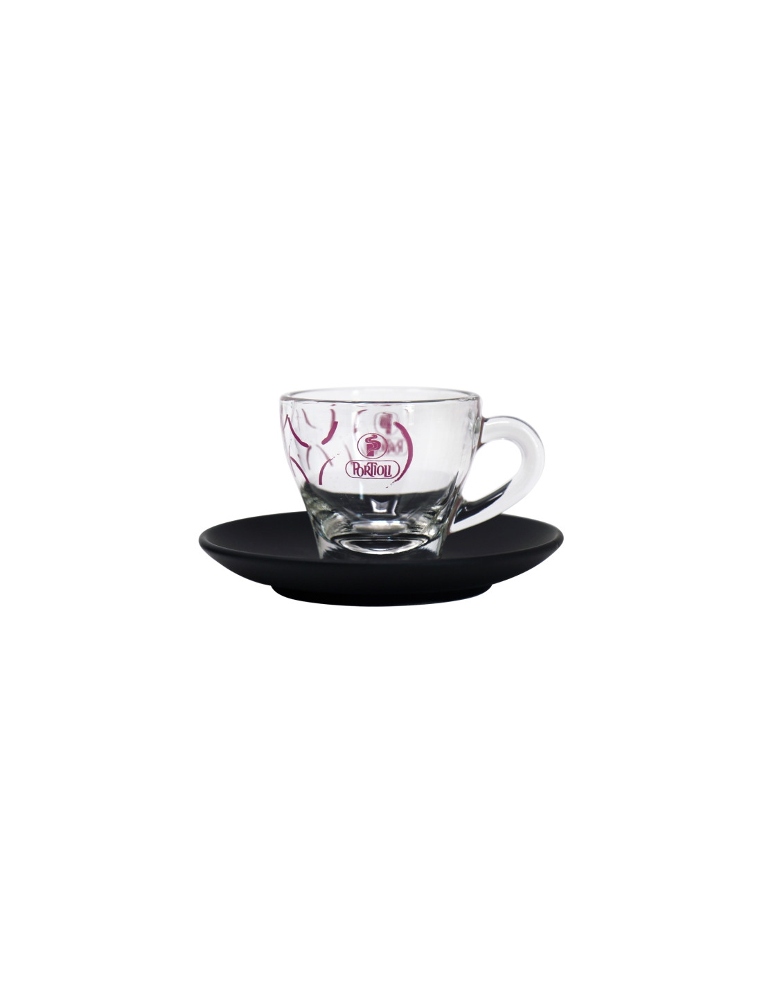 Die Glas-Kaffeetassen von Portioli sind aus transparentem Glas gefertigt und mit Grafiken und dem Logo von Portioli Style personalisiert.